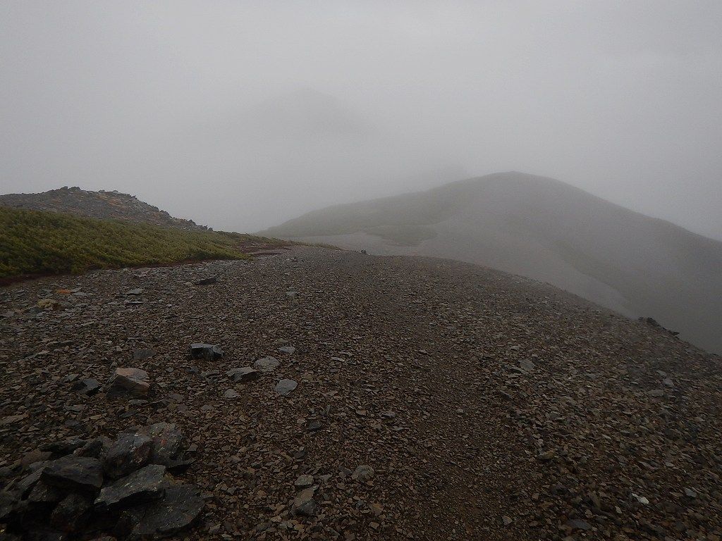 ここから晴れていれば気持ちがいいであろう広大な砂利の稜線を蝙蝠岳に向かって進んでいく。雲の切れ間から時折、蝙蝠岳が見え隠れするのが救いか。