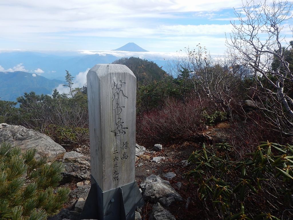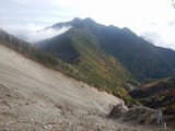 山頂から小笊の延長に見える富士山が印象的だ。振り返れば歩いてきた青薙山、稲又山は、綺麗に紅葉している。遙か遠くに間ノ岳も見える。あそこまで歩けるだろうか。日没までに転付峠へと思い、先を急ぐ。椹島下降点まで一気に200メートル下り、再び這松尾山手前までの登り返し。下降点からの先の稜線も踏み跡は比較的しっかりしている。