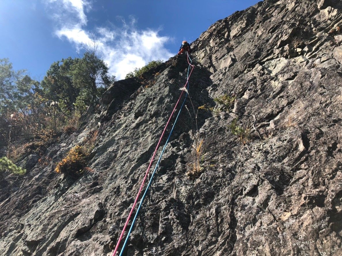 三峰の頭を経由し温故知新の1ピッチ目の終了点に向けクライムダウン。50Mの懸垂にて無事地上に復帰。