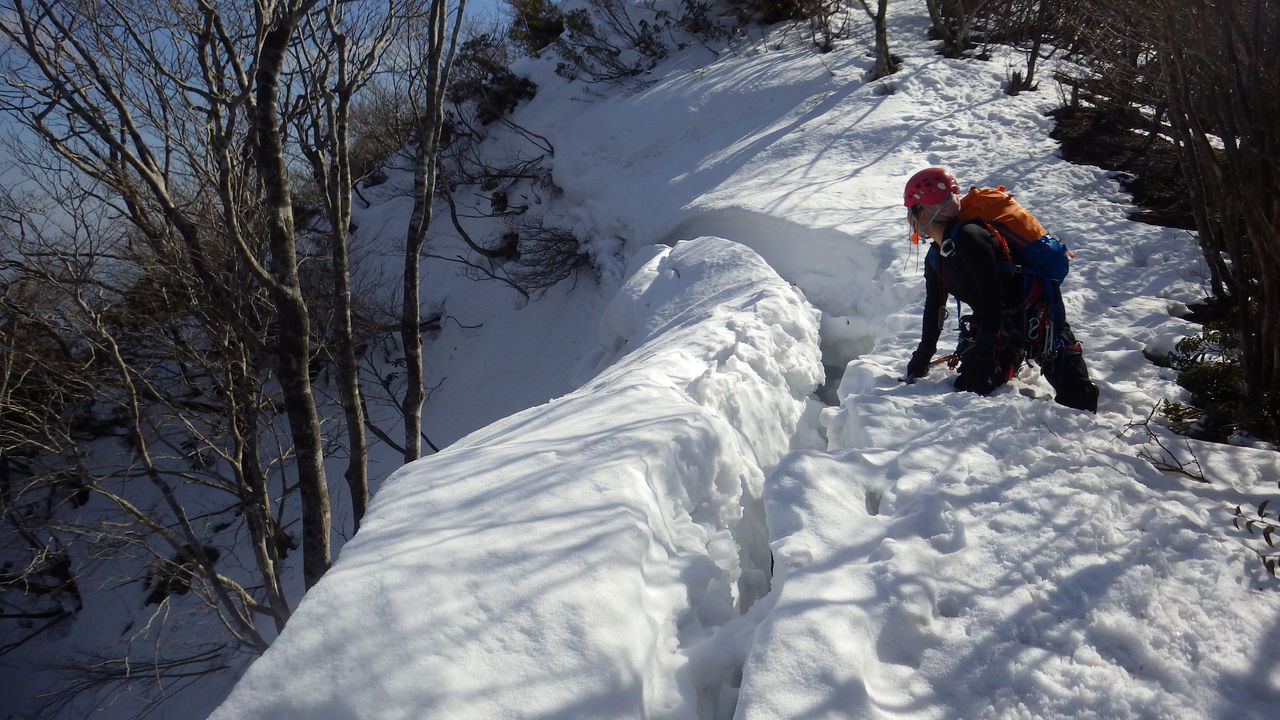 出だしにⅢ級程度の岩があり、それを乗っ越して岩と雪をしばらく進む。立木でビレイ。