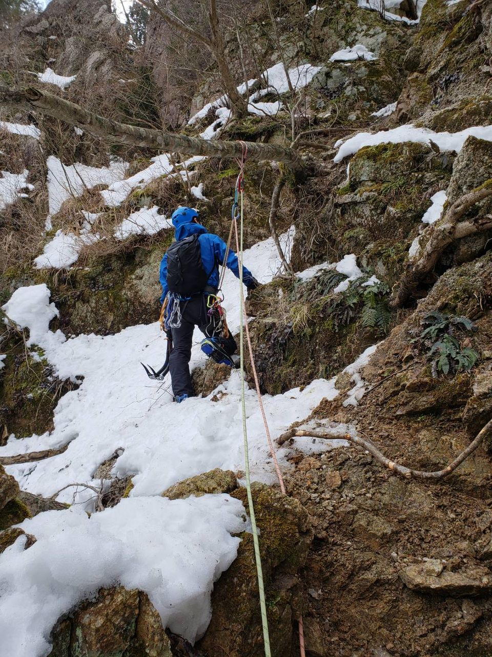 続けて竹内さんのリード。階段状になっている岩と草付きに雪がちらほら。難なく通過し、立木でビレイ。