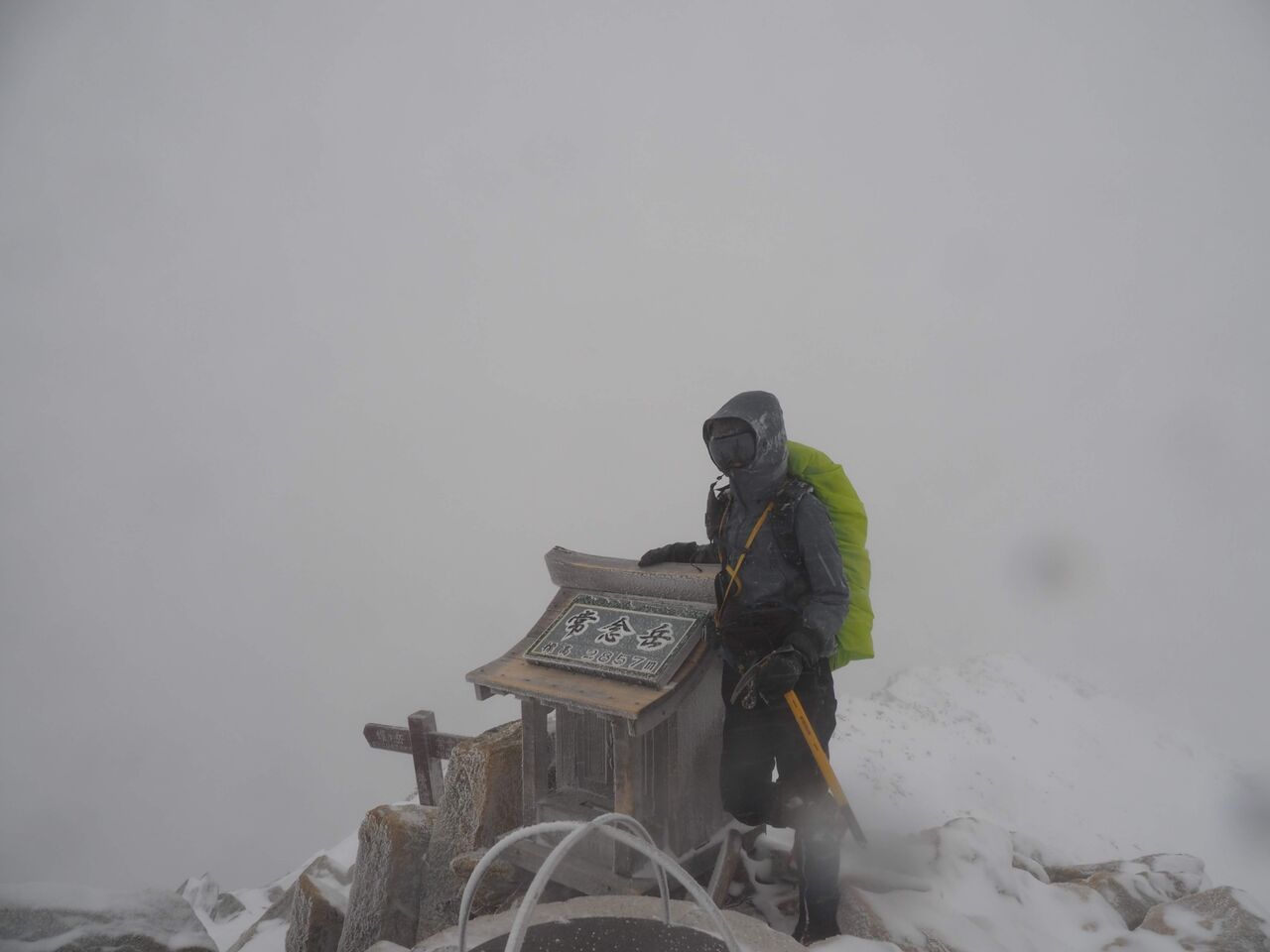 前常念から約2時間で山頂へ。吹雪で視界なし。カメラもウェアも凍てつく。