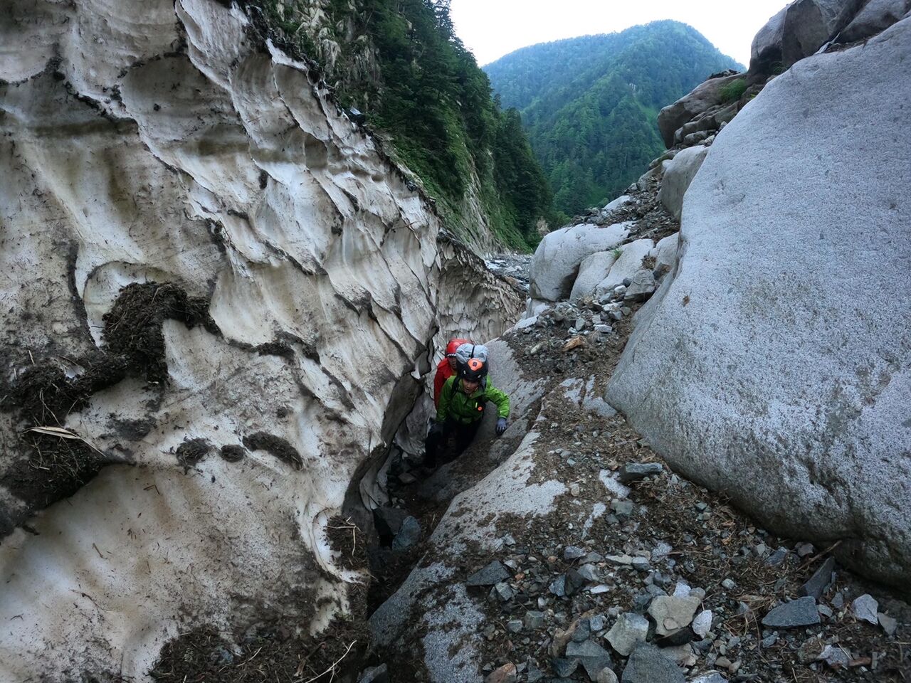 始め浮石はさほど多くもなかったので大げさな注意喚起だと思った。が途中から終始浮石だらけになり、雪渓も現れた。その時に猛烈な雷雨がやってきて厳しさ極限!白出沢に流れ込む支流の鉱石沢の崩壊が凄まじく、そこに張られていたFIXロープを使い懸垂下降した。懸垂してる自分のロープが堆積してる石をひっかけ落石を落とす。恐ろしい。その先には小滝が連続する。巻道も崩壊している。一つ目の滝は倒木で懸垂下降。次は軟鉄のハーケンで残置支点を作り懸垂下降。重太郎橋など跡形もない。渡渉ポイントを心配していたが当たり一面はゴーロ帯の為、何処でも渡る事ができた。また前日と直前の物凄い夕立による増水の影響もなかった。