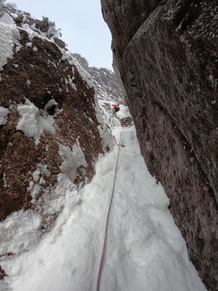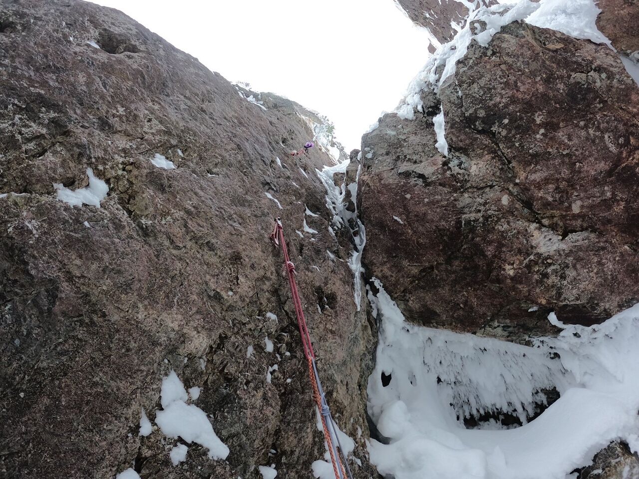 (ルンゼ右側の氷を登る)