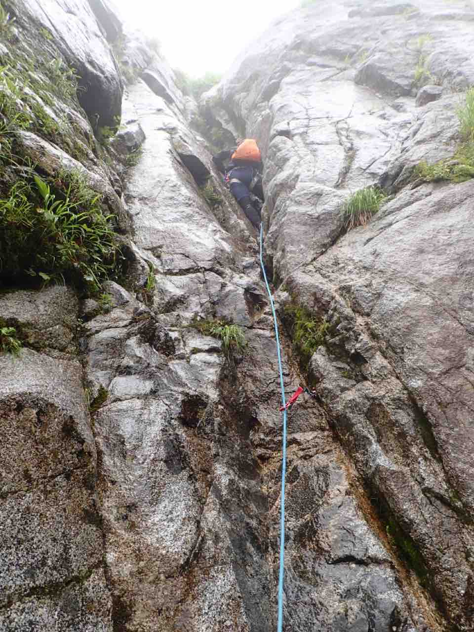 右のルンゼをロープを出して