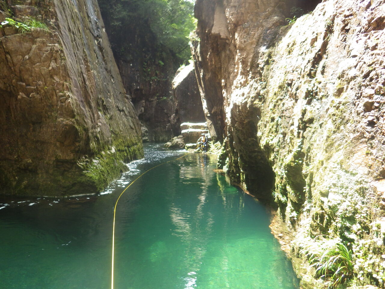 いやぁ良かったと喜びつつ、50mのゴルジュはダイさんに先行してもらい、僕は引っ張ってもらう。快適!