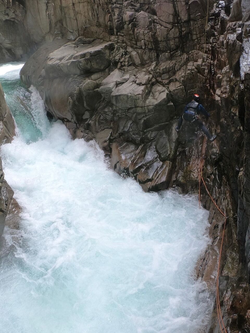 引っ張るザックが重すぎて、とりあえずハーケンにザックの荷重移そうとクローブヒッチで固定すると、ハーケンが岩ごと剥がれた。ロープを介してザックは自分と繋がっていたので、やべえと思って渾身の力でザックが流れるのを止める。あろうことか手元でロープが絡まってしまって、流されるザックをひっぱったりしながらどうにか絡まりをほどいてとりあえず荷物を流れに任せると、下の滝まで行ってしまって、また動かなくなる。全力で引っ張る。