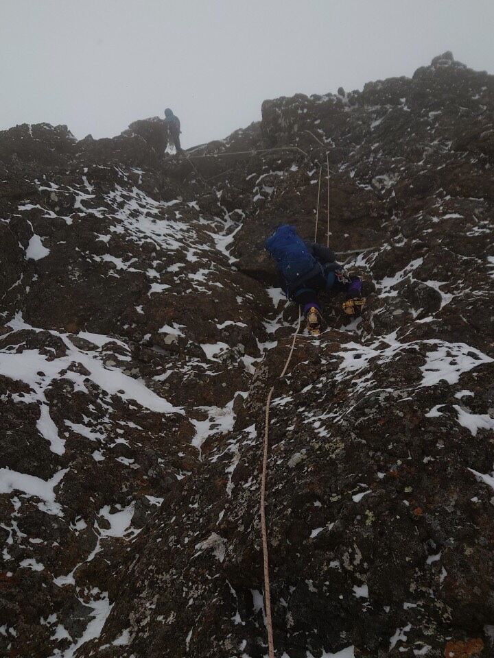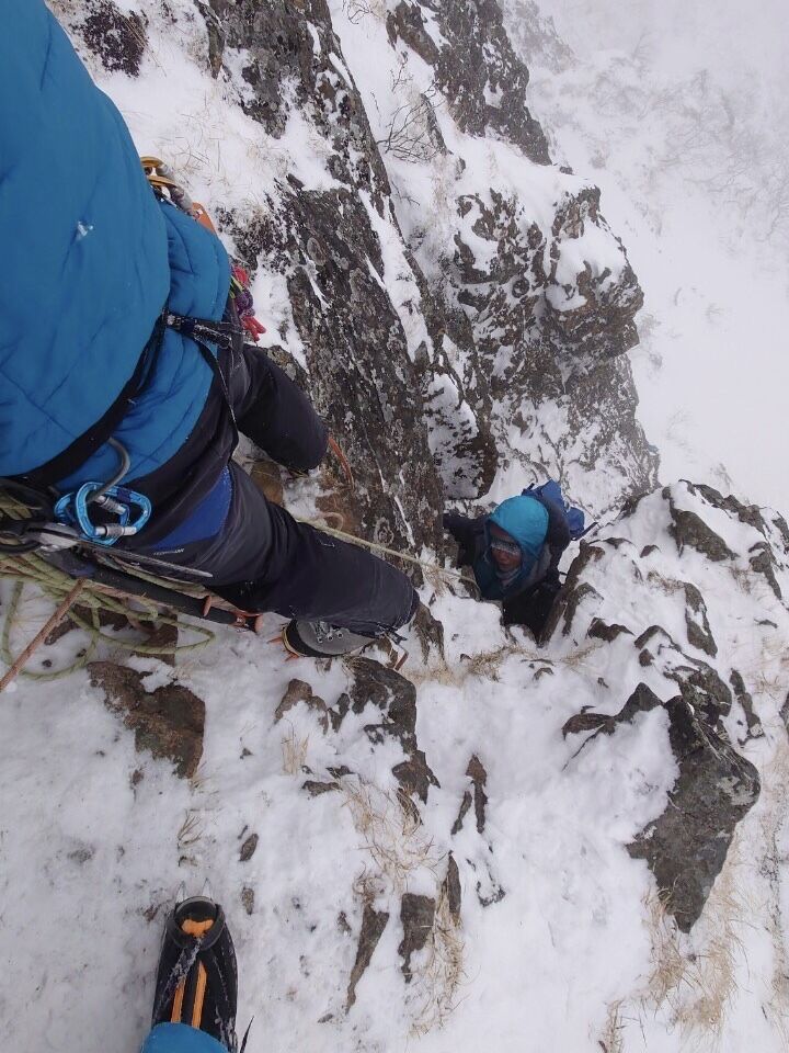 最後のピーク基部までの登りはロープ出すか迷うくらいな感じだったが、イケイケゴーゴーながんちゃんにロープをつけてもらい一応アヤちゃんは確保して登ってもらうことにする。