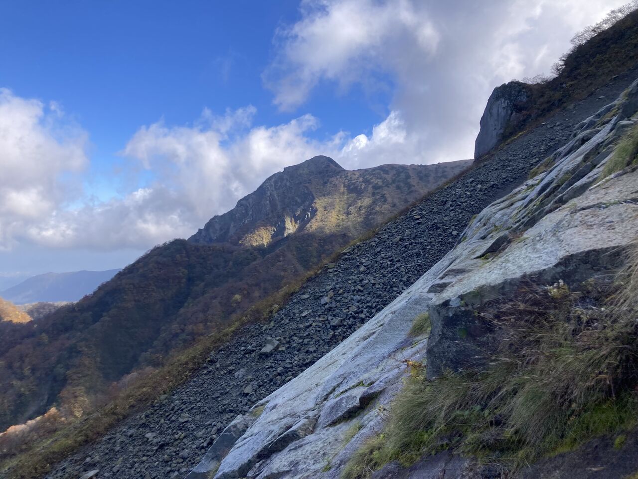 ガレ沢をトラバースして尾根の側壁にハンマーを