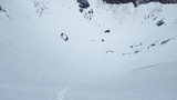 序盤は傾斜がキツく、ビビりながら滑走するが、雪面は意外にも適度なザラメとなっており、快適に滑走。
