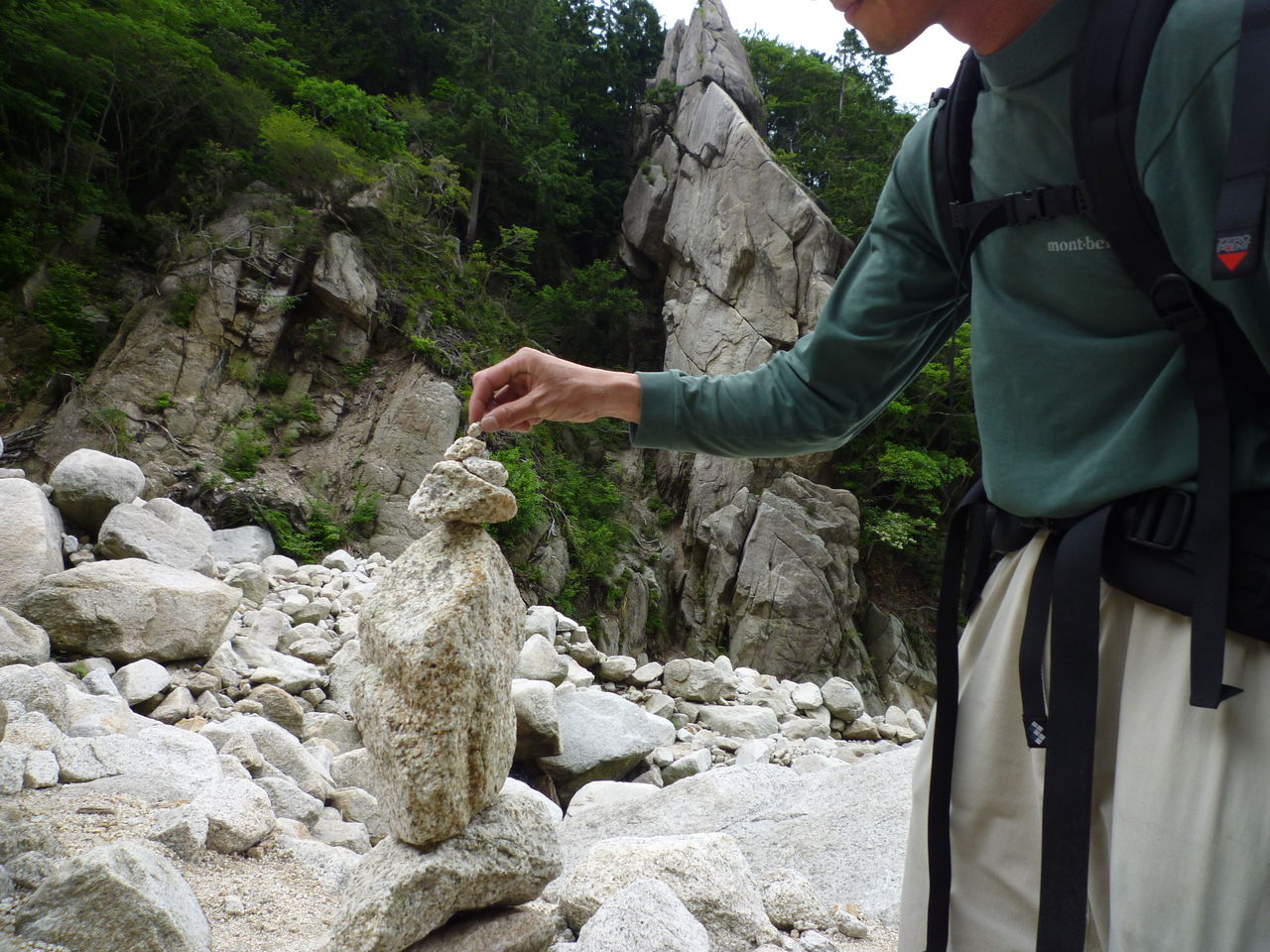 誰かが積み上げた芸術的なケルンにさらに石を載せるA木くんw
